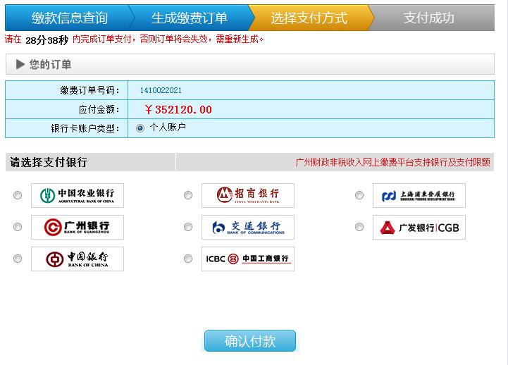 步骤四 确认付款,缴费订单成功生成后,页面展示缴费订单号码、应付金额。确认应付金额,从银行列表中选择一家银行(此处以招商银行为例),点击“确认付款”按钮。