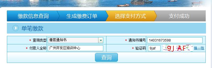 步骤二 缴款查询,正确选择查询类型(缴款通知书或交通违法文书),填写编号(通知书编号或交通违法文书编号)、付款人全称和验证码(大小写均可)。确认所填信息无误后点击“查询”按钮。