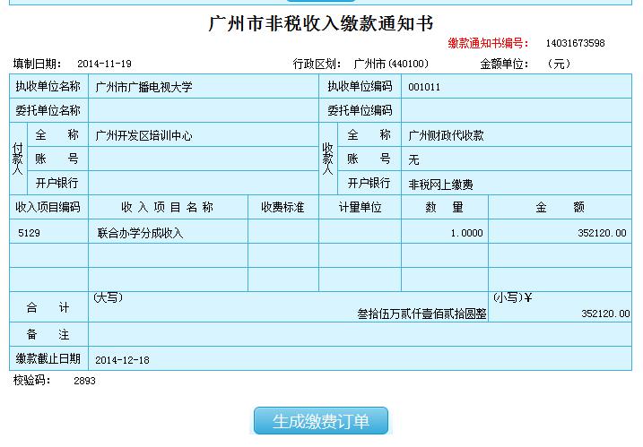 步骤三 生成缴费订单,网页显示通知书或文书的详细内容,确认通知书或文书信息无误后点击“生成缴费订单”按钮。